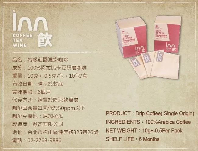 【歐杰inn】特級莊園濾掛式咖啡2入組(10包/入)描述: